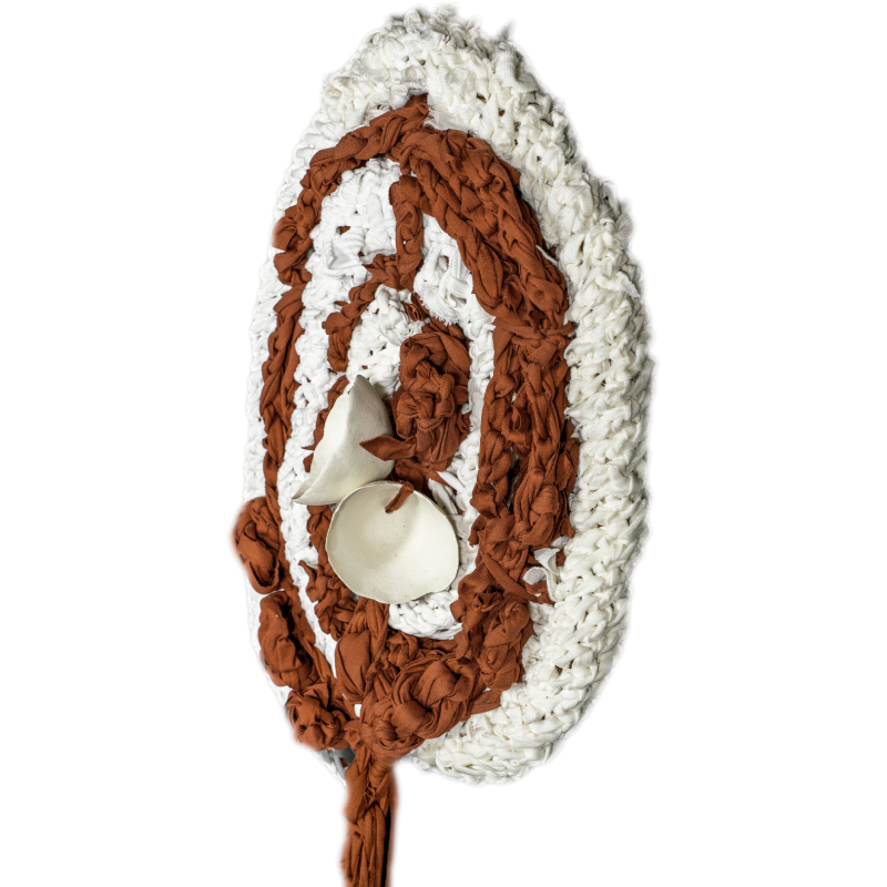 Tricô e crochê em fios de malha de resíduos da indústria da moda; massa cerâmica paperclay (argila + polpa de papel) modelada à mão com queima em alta temperatura.